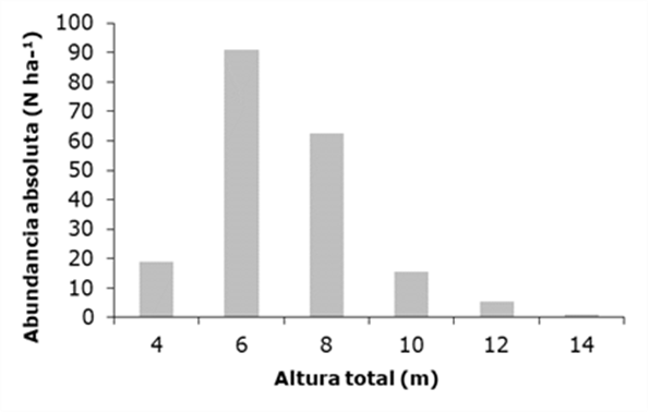 El gráfico de clases de altura muestra una escasa presencia de árboles de porte bajo (categoría 2 - 4 m; 19 N ha-1) y la más alta en la categoría de 4.01 a 6 m (91 N ha-1). La distribución de individuos en categorías de altura tuvo una distribución asimétrica positiva (Figura 3).