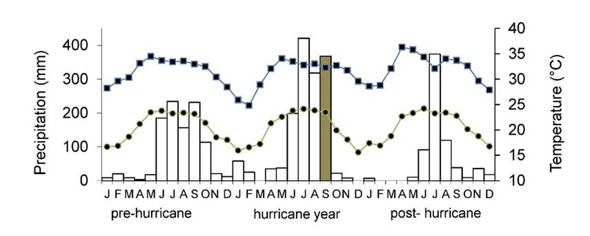 For the hurricane year, rainfall was higher (1 440 mm) than the average (932 mm) for the region (Figure 1). However, precipitation (Χ 2 = 1.84, P = 0.60), maximum temperature (Χ 2 = 1.81, P = 0.61) and minimum temperature (Χ 2 = 0.23, P = 0.97) for the hurricane year (2010) did not differ statistically from the climate variables recorded during pre-hurricane (2007-2009) and the post-hurricane (2011) year (Figure 1).
