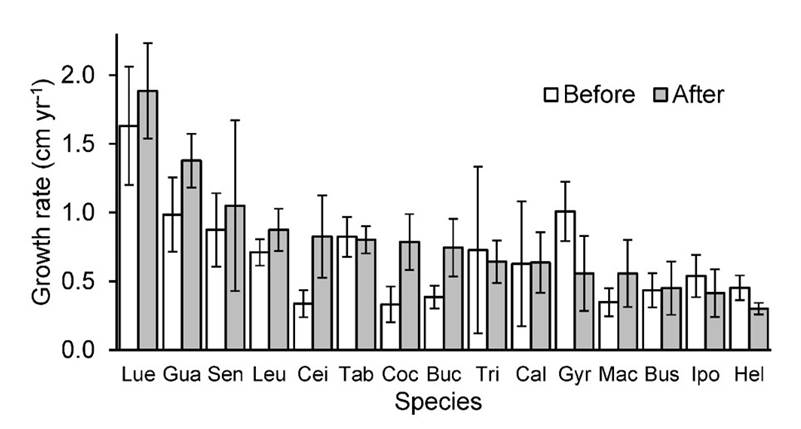 Overall, there were significant differences between pre- (0.68 + 0.09 cm yr-1) and post-hurricane (0.79 + 0.10 cm yr-1) growth rate (Χ 2 = 5.12, P = 0.024) and among species (Χ 2 = 66.36, P < 0.0001, Figure 2). However, the interaction between species and hurricane effect was not significant (Χ 2 = 17.16, P = 0.25). The studied species diameter growth rates before and after the hurricane varied from 0.33 to 1.63 cm yr-1 and 0.30 to 1.89 cm yr-1, respectively (Figure 2). The species with the highest diametric growth was Luehea candida (DC.) Mart., followed by Guazuma ulmifolia Lam. and Senna atomaria.