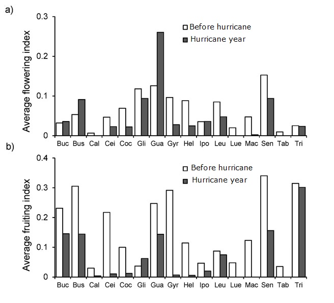 At the species level, the vegetative phenological patterns remained similar before and after the hurricane. In contrast, intensity of the reproductive phenophases was affected by the hurricane (Figures 3 and 4). For most species (12), flowering intensity decreased in the post-hurricane year, and three species did not flower at all (Calyptranthes schiedeana, Luehea candida and Tabebuia chrysantha), while for two others (Bursera simaruba and Guazuma ulmifolia) (Figure 4a) flowering intensity was higher after the hurricane. Fruiting during the year following the hurricane was null in four species, and lower for most of the species, or the fruiting peak was shifted (Leucaena lanceolata and Senna atomaria); only one species (Gliricidia sepium (Jacq.) Kunth ex Walp.) showed higher fruiting after the hurricane (Figure 4b).