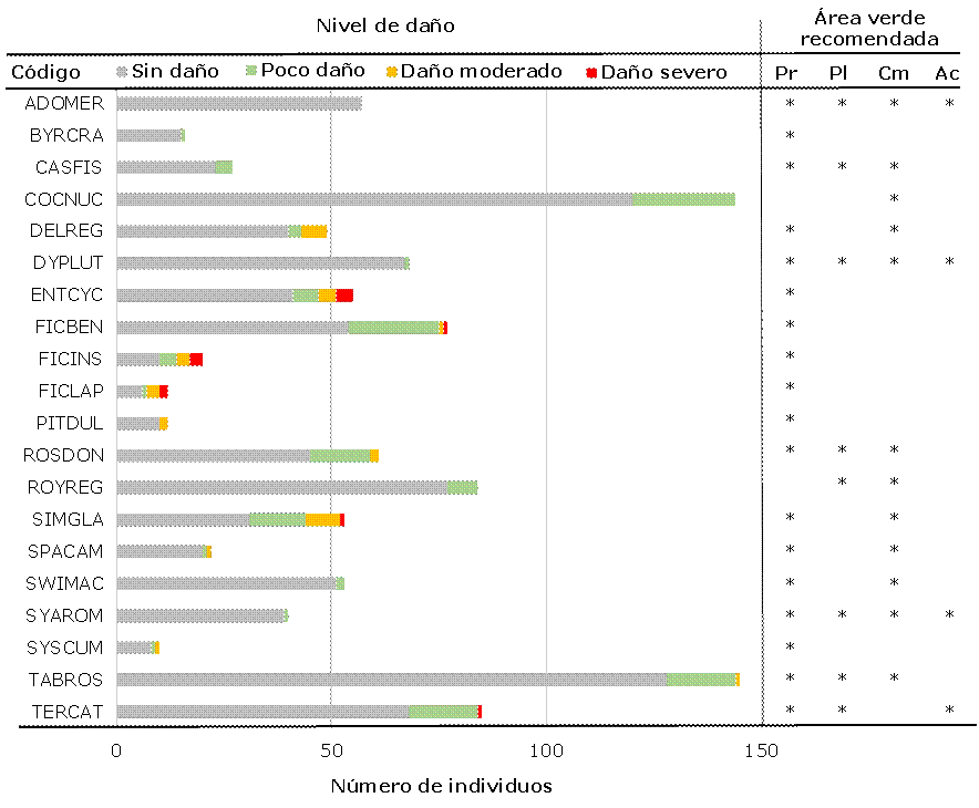 Finalmente, para cada individuo, árbol o palma, se sumó el puntaje de las variables de condición de la infraestructura y el porcentaje de daño, el cual correspondió a un puntaje total y una categoría de daño (Cuadro 3). El nivel de daño se determinó en las especies con (10 individuos y presentes en cualquiera de todas las áreas verdes bajo estudio, para que los patrones identificados fueran representativos de las especies más abundantes o frecuentes.