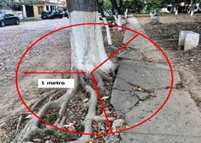 Se representó con la variable de distancia a la infraestructura, interpretada como el espacio disponible del árbol para crecer; para ello, se midió el espacio entre la base del árbol y la infraestructura más cercana, como pueden ser una acera, banqueta, andador o bordes que delimitan una jardinera; la infraestructura estuvo elaborada, principalmente, por cemento adoquín (Acuña, 1999; Benavides et al., 2004).