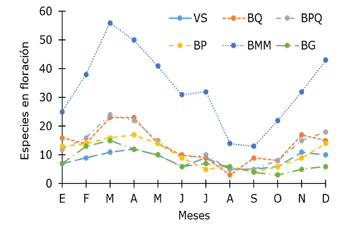 VS = Secondary vegetation; BQ = Quercus forest; BPQ = Pinus-Quercus forest; BP = Pinus forest; BMM = Mesophilic mountain forest; BG = Gallery forest. Especies en floración = Species in flowering; Meses = Months.