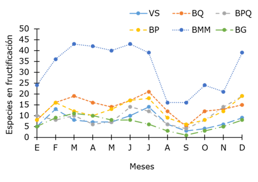 Fruiting by plant community is a little more heterogeneous in its behavior while tending to the fruiting pattern exhibited by all taxa. Greater richness of fruiting species was observed from February to July, with a decrease from August to October, and an increase in November and December (Figure 5).