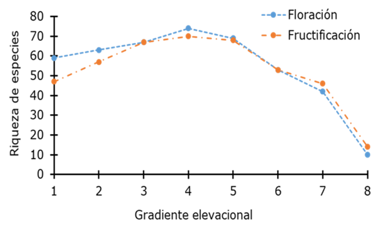 The richness of flowering and fruiting species was greatest at the altitude range of 1 700 to 2 000 masl, with a very noticeable drop above 2 100 masl (Figure 6).