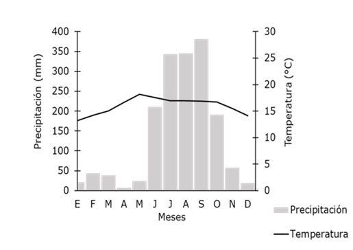 The vegetation corresponds to mesophilic mountain forest (MMF), Pinus forest (PF), Quercus forest (QF), gallery forest (GF), Pinus-Quercus forest (PQF), secondary vegetation (SV), pine shoot (PS), grassland and agricultural land (GA), and rock outcropping and erosion (RE) (Jardel et al., 2004). Since 1985, the ECLJ has been exempt from disturbances such as agriculture, livestock and forestry harvesting; however, some surface fires and the occurrence of cyclones such as Jova and Patricia in 2011 and 2015, respectively, eventually occur. The climate is markedly seasonal, with a cold season from October to January, a dry season from February to May and a rainy season from June to September. Based on the climatic records of the last 30 years, the average annual temperature and precipitation have been 15.5 °C and 1 663 mm, respectively; according to information from the local weather station (Figure 1).