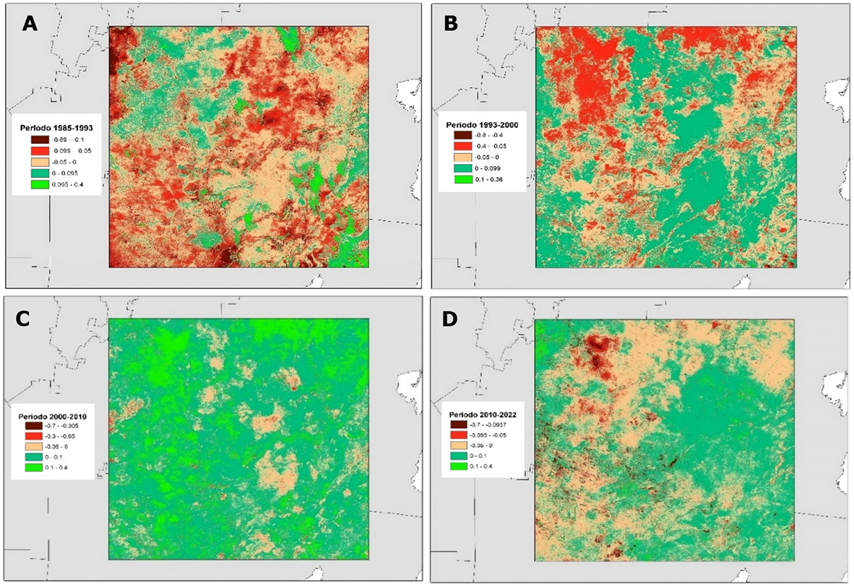 Los valores del NDVI de 1993 disminuyeron en 960 468 ha, correspondiente a 79.1 % de la superficie total bajo estudio, con respecto a los valores de 1985, y para 1993, 693 509 ha, que representaron 57.1 % en relación al 2000. Los NDVI del 2000 redujeron sus valores en 197 882 ha (6.3 %) para 2010, pero hubo un aumento en 1 015 632 ha, es decir, 83.7 %, lo que constituyó una importante recuperación de la cobertura forestal. Finalmente, de 2010 a 2022, el NDVI disminuyó 619 896 ha (51.1 %) y continuó la revegetación con un aumento en 593 617 ha (48.9 %) con relación a la superficie total del área de estudio. Estos cambios en los valores del NDVI coinciden con los hallazgos de Sánchez-Rivera y Gómez-Mendoza (2022), quienes registraron para el periodo de 2000 a 2010 que 67 % de los ciclones tropicales ocurridos en la Península de Yucatán, impactaron de manera negativa la vegetación de la región y ocasionaron una disminución en los valores del NDVI.