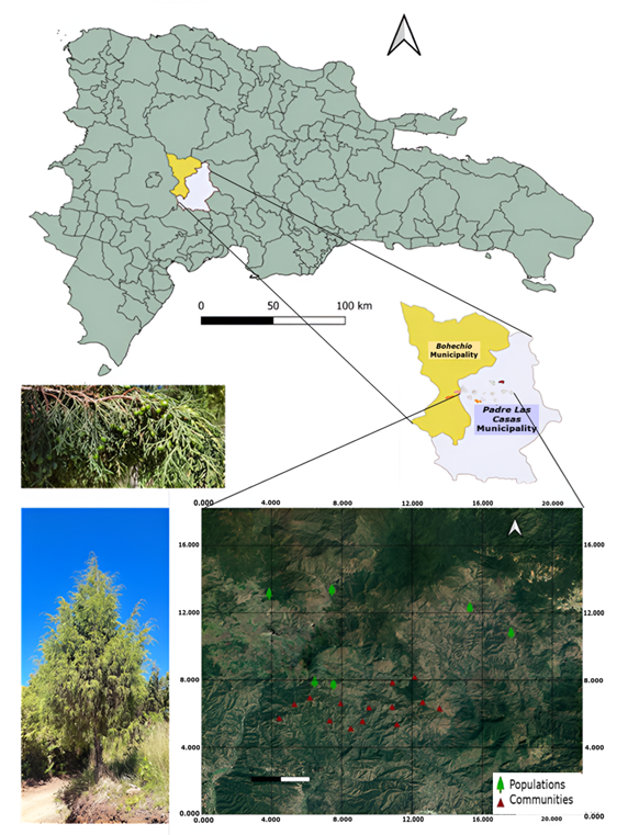 Through literature review (Zanoni y Mejía, 1989; Farjon, 2013; Adams, 2014; MESCyT, García et al., 2016; Juncá et al., 2021), consultation with experts and field explorations, five population remnants of J. gracilior var. gracilior were detected. Data collection was carried out in 14 rural communities (Figure 1) that are located within a radius of less than 7 km from the protected area and in which semi-structured interviews with open and closed questions were applied to 102 people.
