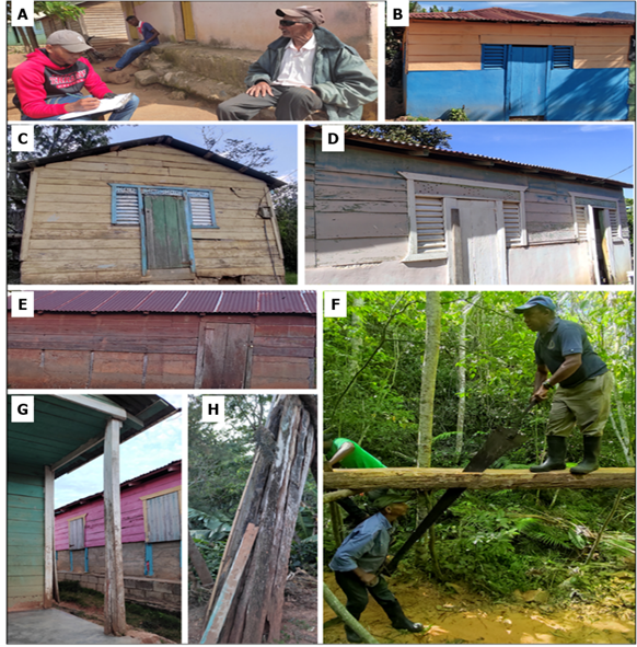 A = Interview with a community member; B, C, D and E = Houses in the town of Los Fríos with doors, blinds and boards of the species; F = Men sawing a log of a dry timber tree, in the same way as J. gracilior var. gracilior for the extraction of timber pieces; G = Post on the balcony of a house; H = Posts for house construction.