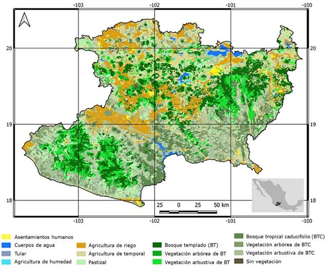 El área de estudio corresponde al estado de Michoacán, ubicado en el centro occidente de México, entre los 18º y 21º N y los 100º y 104º O. El territorio es atravesado de oriente a poniente por dos estructuras montañosas: el Eje Volcánico Transversal y la Sierra Madre del Sur. Los climas predominantes son: Aw tropical lluvioso con lluvias en verano, BS seco estepario y Cw templado con lluvias en verano. El intervalo altitudinal es de 0 m a cerca de 4 000 m. Coexisten diferentes tipos de bosque templado (pino, encino, oyamel y mesófilo), con la vegetación asociada secundaria arbórea y arbustiva; también se desarrolla el bosque tropical caducifolio y su vegetación secundaria arbórea y arbustiva; la agricultura es tanto de riego, como de temporal, con zonas de agricultura de humedad; además hay pastizales y matorrales; el resto de coberturas (tulares, manglares y vegetación hidrófila), junto con asentamientos humanos, zonas sin vegetación y cuerpos de agua son poco susceptibles de presentar incendios (Durán y Sevilla, 2003; Rzedowski, 2006). En la Figura 1 se muestra el mapa de coberturas vegetales e el estado de Michoacán.