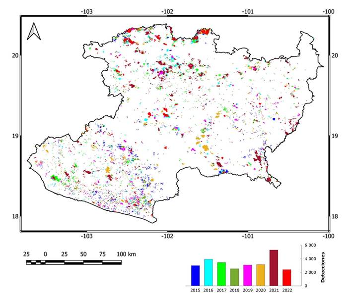 El mapa de la Figura 3 muestra las detecciones de incendios en el estado de Michoacán cada año entre 2015 y 2022. Se contabilizaron 26 727 pixeles en total con detección de incendios (3 340.87 detecciones anuales en promedio); 2021 fue el año con el mayor número (5 269) y 2022 el año con el menor (2 398).