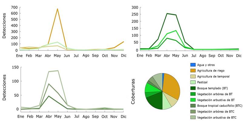 Las detecciones en bosques templados suponen un tercio del total y afectan más a los bosques que a la vegetación secundaria; en zonas de bosque tropical caducifolio, los incendios ocurren en vegetación secundaria, lo que indica la reincidencia de las perturbaciones.
