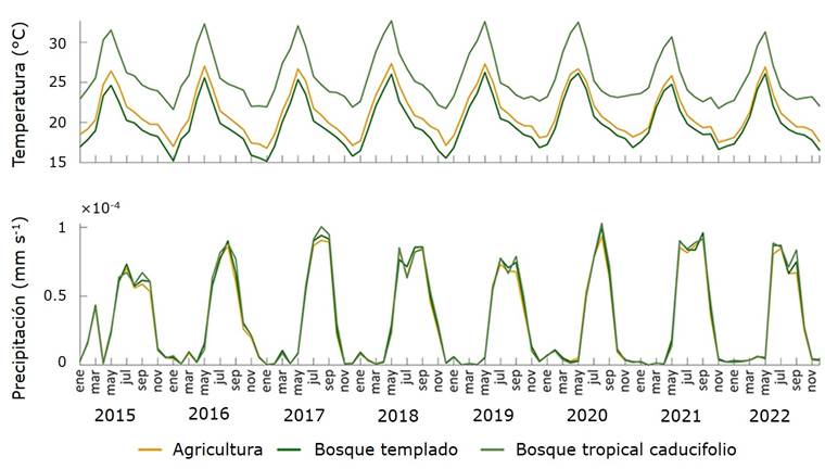 En la Figura 7, se muestra la variación por mes y año de las variables climáticas analizadas correspondientes a las coberturas vegetales agricultura, bosque templado y bosque tropical caducifolio, con sus respectivas vegetaciones secundarias. La agricultura y el bosque templado se ubican en zonas climáticas similares, con promedios anuales en el periodo de 21.17 °C y 19.92 °C, respectivamente; mientras que en el bosque tropical caducifolio, las temperaturas son más elevadas, con un promedio general de 25.64 °C. Las precipitaciones son similares en todo el territorio, con pequeñas diferencias entre coberturas en los máximos de los meses más lluviosos.