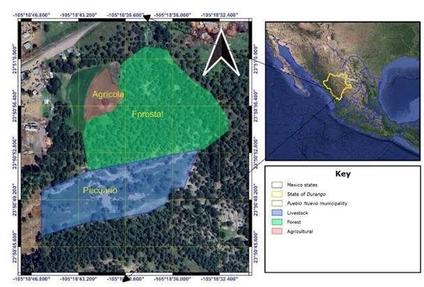 The study area is located in the Sierra Madre Occidental mountain massif in the state of Durango, in the José María Morelos ejido within the Pueblo Nuevo municipality, between 23°50'57” N and -105°18'41” W (Figure, 1).