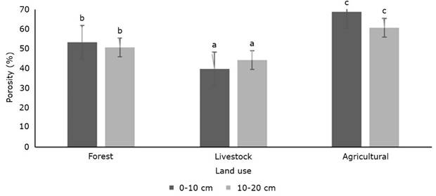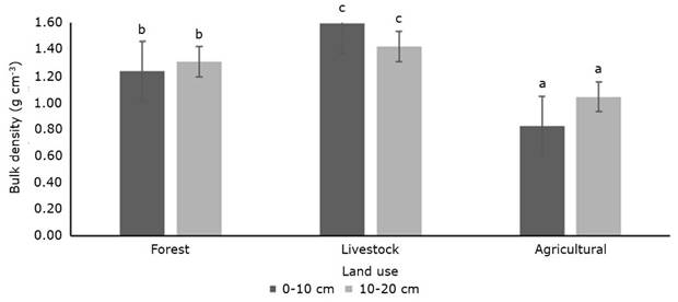 Figure 2 shows the values by depth and land use for BD. The forest area had a value of 1.24 g cm-3 from 0 to 10 cm, while agricultural and livestock uses recorded lower and higher BD values (34 and 24 %) compared to the forest area. For the 10-20 cm depth the trend was similar; the forest area presented an BD of 1.31 g cm-3 and the agricultural and livestock uses 14 and 17 % higher and lower values, respectively.