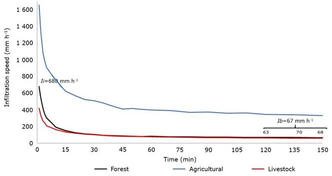 Variable Ii was 680 mm h-1 in the forest area, with an increase of 145 % in the agricultural area and a decrease of 40 % in livestock use. The Ib was similar between the forest area and livestock use, however, it increased by 500 % in the agricultural area. While the Ia presented the following order of descending: agricultural>forest>livestock (Table 5).