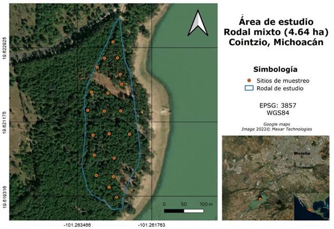 El levantamiento de datos se realizó en 20 sitios de muestreo establecidos en un bosque plantado mixto de aproximadamente 35 años de edad, con una superficie de 4.64 ha, ubicado en la ribera de la presa de Cointzio, localizada a 12 km al suroeste de la ciudad de Morelia, Michoacán, México (LN: 19.621; LO: -101.262). Las especies principales en la plantación son: Cupressus lindleyi Klotzsch ex Endl. y Pinus leiophylla Schiede ex Schltdl. & Cham., además de ejemplares aislados de Eucalyptus sp. y Casuarina equisetifolia L., tales taxones fueron parte de bosques plantados para restauración y conservación de suelo (Figura 1).