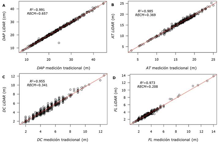 En el comparativo por regresión lineal de los parámetros analizados, en términos de la desviación de las estimaciones con la tecnología LiDAR+AR y de las mediciones de referencia, se observó en general un buen ajuste, con una R 2 =0.991 y un RECM=0.657 cm para el DAP; R 2 =0.985 y un RECM=0.369 m para la AT, R 2 =0.955 y un RECM=0.341 cm para el DC, y R 2 =0.973 y un RECM=0.208 cm para el FL (Figura 2, Cuadro 3).