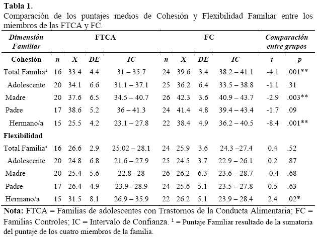 Algunos investigadores han reportado que las madres de adolescentes con TCA perciben menor cohesión, flexibilidad y peor comunicación en sus familias que las madres de familias controles (Vidovic et al., 2005) y que los hermanos de pacientes con AN perciben menor cohesión familiar que los hermanos de adolescentes sin trastornos psiquiátricos (Cook Darzens et al., 2005).