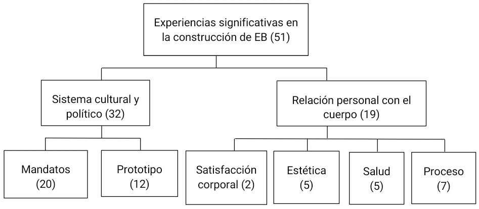 En cuanto a las experiencias significativas en la representación de EB se logra identificar que existe consenso en torno a que el sistema cultural y político ha influido históricamente en su construcción, mediante diversos mandatos sobre cómo tiene que ser la mujer, siempre vinculados al mantenimiento y seguimiento de una estética en particular (De la Morena, 2019; Guzmán & Salazar, 2016). Cabe destacar que las PS refieren que, a lo largo de su vida, han llevado a cabo un proceso personal que les ha hecho comprender que la salud es más importante que una estética determinada, otorgando más relevancia a sentirse fuertes y sanas que a cumplir con estándares particulares, logrando de forma paulatina derribar estos.