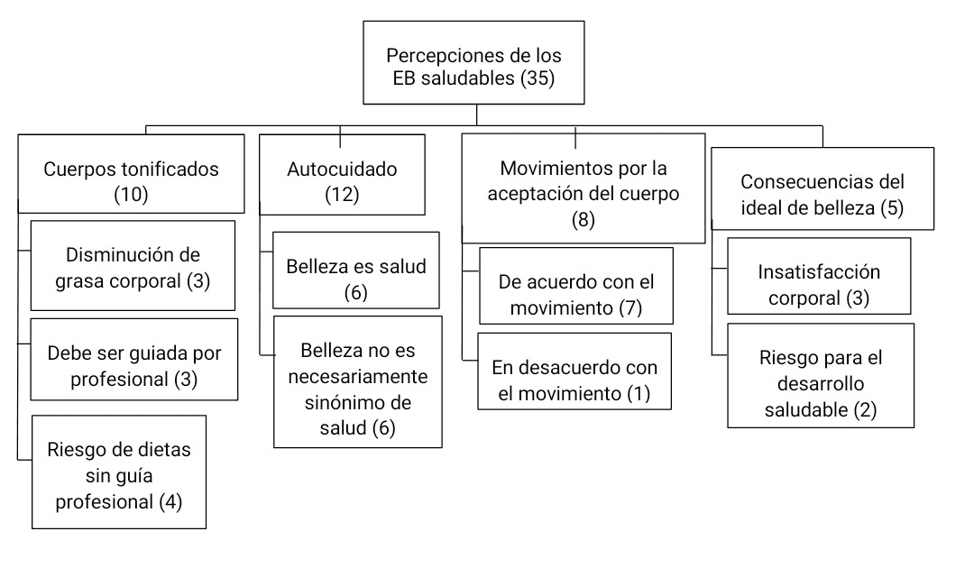 En el segundo núcleo (Figura 2), Percepciones de los EB saludables, surge como primera categoría, Autocuidado (12 citas), es descrita como un factor saludable en la percepción de EB. Se considera que la Belleza es salud, visualizando la belleza como un efecto secundario de la salud: “La belleza puede ser un efecto secundario de tu salud, porque si tú quieres embellecerte, no como trastorno, sino que por un tema de que tú te quieres ver bien, si es concordante con tener una alimentación sana y saludable” (P1). “Yo creo que estar como saludable y eso se refleja, cuando una persona se siente bien con su cuerpo lo refleja siempre, se nota” (N5).