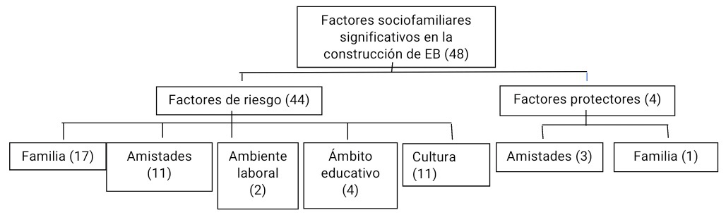 En el tercer núcleo (Figura 3), Factores sociofamiliares significativos en la construcción de EB, surge como principal categoría, por el número de citas, los Factores de riesgo (44 citas), se considera en primer lugar a la Familia debido a las concepciones preestablecidas del contexto familiar respecto a lo considerado bello y los EB transmitidos generacionalmente: “A veces en las peores situaciones, los familiares son los que obviamente critican más entonces la persona más va cayendo y más va entrando en estos trastornos de la conducta alimentaria” (N1). “ Estaba con una paciente que ella tiene como muy claro ‘sí, yo sé yo sé que esta relación que tengo con mi cuerpo, de alimentación, no está bien’, pero llega a la casa, cuando se atreve a comer algo que tiene prohibido, viene su madre y le dice ‘estás comiendo demás’” (P2).