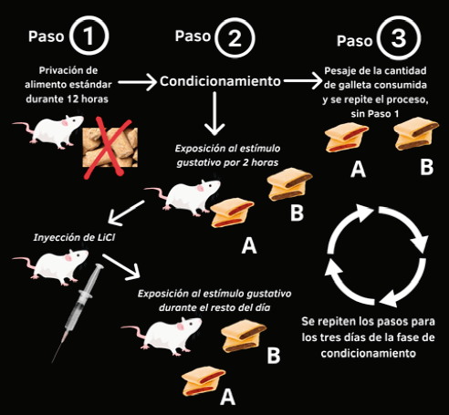 El condicionamiento aversivo a sabores (CAS) es un procedimiento que puede explicar el fenómeno de las conductas alimentarias de rechazo (de la Torre et al., 2004; Garcia et al., 1955; Garcia & Koelling, 1966). Este procedimiento puede aportar información relevante acerca del por qué no ingerimos ciertos alimentos, además de que puede funcionar como entrenamiento para evitar el consumo de alimentos que pongan en riesgo el estado del organismo (Manuelian et al., 2016; Ruiz et al., 2020). El CAS puede emplearse para el estudio de procesos como aprender y recordar debido a su pronta adquisición, su permanencia, así como su implementación a pesar de largas demoras que se presentan entre estímulos (de la Torre et al., 2004). En una situación experimental de laboratorio con modelos murinos, el ensayo más utilizado para el desarrollo del CAS consiste en la presentación de una sustancia química (estímulo incondicionado, EI) que produce un malestar físico (respuesta incondicionada, RI), que es asociada a una solución endulzada. Posterior a algunos ensayos, el alimento (ahora estímulo condicionado, EC) es rechazado por el sujeto (respuesta condicionada, RC), provocando una conducta de aversión al sabor o alimento como consecuencia de la asociación de los dos estímulos (Molero, 2007; Swank et al., 1995). Se ha demostrado que la corteza gustativa tiene un papel fundamental en los procesos de aprendizaje de sabores, palatabilidad y CAS (Flores et al., 2018).