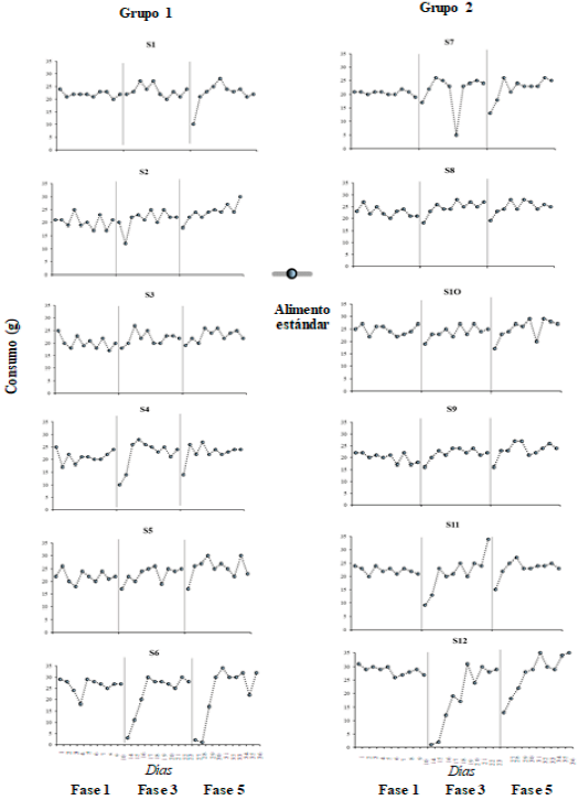 En cuanto al alimento estándar, los sujetos de todos los grupos consumieron cantidades similares durante las fases 1, 3, 5 (Tabla 3). No hubo efectos significativos de la fase ni del grupo en la cantidad de alimento consumido (Tabla 4). En la Figura 2 se muestran los consumos diarios de los 12 sujetos de los grupos 1 y 2 durante dichas fases. Se observa que, en la fase 1, todos los sujetos tuvieron patrones de consumo similares independientemente de los grupos. En la fase 3 el consumo continuó con un promedio similar, sin embargo, en los sujetos S4, S6, S11 y S12 los primeros días de exposición el consumo disminuyó drásticamente (siendo casi nulo en S6 y S12), pero fue incrementando conforme avanzaban los días. Análogamente, en la fase 5 los consumos promedio se mantuvieron similares a las fases anteriores; sin embargo, al igual que en la fase 3, el consumo inicial fue bajo en los sujetos S6, S7 y S12 (siendo casi nulo en S6), aumentando y estabilizándose conforme pasaron los días. Estas fluctuaciones en los consumos iniciales y finales de las fases 3 y 5 no se observaron en los sujetos de los grupos 1C y 2C.