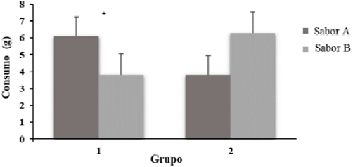 Figura 3. Representación de la media y desviación estándar del consumo en gramos durante la exposición de dos horas de galletas sabor A y B en la fase 2 de condicionamiento (previo al CAS) para los grupos 1 y 2. El asterisco (*) indica una diferencia significativa en el consumo de galletas con sabores diferentes.