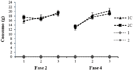 Figura 4. Representación de la media y desviación estándar del consumo en gramos del alimento palatable durante 24 horas por tres días, en las fases 2 y 4. Los símbolos de triángulo y cuadrado representan el consumo de los grupos controles (1C y 2C). El rombo y el circulo representan el nulo consumo de los grupos 1 y 2.