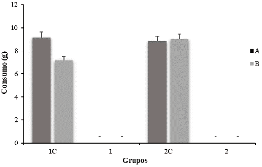 En la Figura 5, se observan las medias de consumo de los sabores A y B de los cuatro grupos en la fase 6 o prueba de elección. Durante la prueba ningún sujeto de los grupos 1 y 2 ingirió galletas, por lo que no se llevaron a cabo pruebas estadísticas para comparar sujetos experimentales y controles. Por otro lado, respecto a los grupos 1C y 2C, se observan un mayor consumo del sabor A para el grupo 1C y consumos similares de A y B para el grupo 2C; sin embargo, las diferencias no fueron significativas de acuerdo a la prueba t de Student pareada (1C: t(5) = 2.01, p = 0.07; 2C: t(5) = 1.51, p = 0.16).