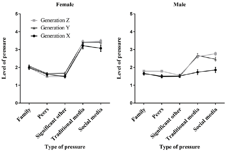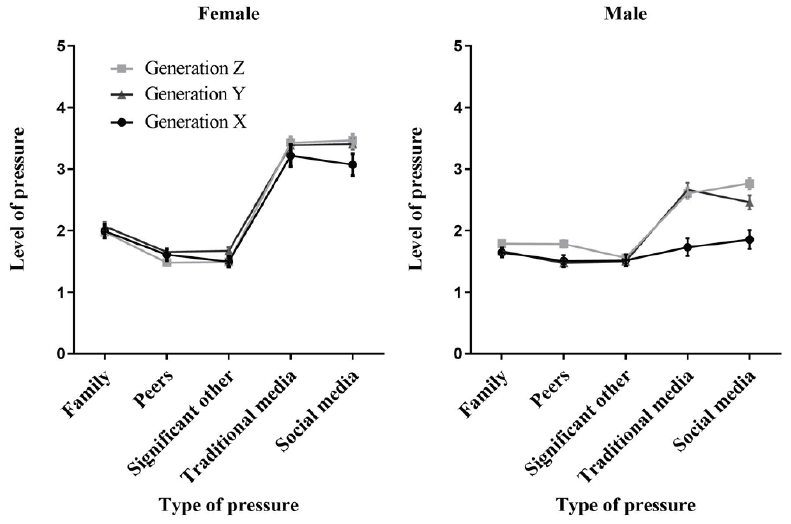A significant three-way interaction effect was found between gender, generation, and type of social pressure (see Figure A.1). ANOVA was performed on each type of pressure with generation and gender as factors showed: a distinct effect of family pressure for each gender (F(1, 827) = 22.77, p = 0.00, ŋp2= .003) with females experiencing more pressure than males regardless of their age (p = 0.00). No significant effects were found for significant other pressure (F(2, 827) = 2.30, p = 0.10, ŋp2 = .005). An effect of peer pressure depending on generation and gender (F(2, 827) = 11.51, p = 0.00, ŋp2 = .027), tukey post-hoc analyses showed that generation Z males experience more pressure than females and that generation Z respondents experience more pressure than older generation Y respondents (p < 0.001). Analyses of traditional media showed a significant interaction between gender and generation (F(2, 827) = 3.73, p = 0.02, ŋp2 = .008). As for gender regarding traditional media, Tukey’s post-hoc analysis showed that females experience more pressure than males (F(1, 827) = 91.96, p = 0.00, ŋp2 = .010) and that there is no difference in how women of different generations experience traditional media pressure. However, generational differences were present in males, with Z males experiencing more pressure than X males (p < 0.0001). Finally, analyses of social media showed that females experience more pressure from social media than men (F(1, 827) = 82.85, p = 0.00, ŋp2 = .009) and that the impact of social media pressure decreases significantly with age (F(2, 827) = 10.88, p = 0.00, ŋp2 = .002).