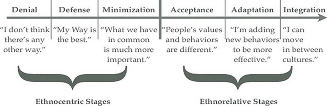 El desarrollo de la competencia intercultural va desde la Negación de las diferencias entre culturas, pasando por la Defensa, que es el punto donde el individuo cree que su cultura es la única correcta y luego, por la Minimización. Cuando el individuo se encuentra en la Aceptación, su cultura es percibida como una de las posibles visiones del mundo entre las otras culturas. En la fase de Adaptación el individuo se comporta apropiadamente, según las reglas de la otra cultura; y en la última fase, la Integración, el individuo es capaz de moverse entre diferentes culturas (Bennett, 2004).