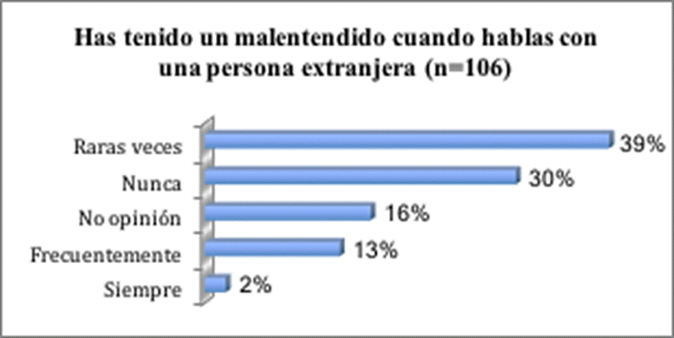 En cambio, en relación con lo que Deardorff (2004) identifica como las habilidades externas, es decir, la capacidad de comunicarse apropiadamente en una situación intercultural, hubo respuestas más variadas. Observando el gráfico que se presenta a continuación (Figura 11) solamente 13% ha tenido frecuentemente malentendidos con personas extranjeras y 39% raras veces.