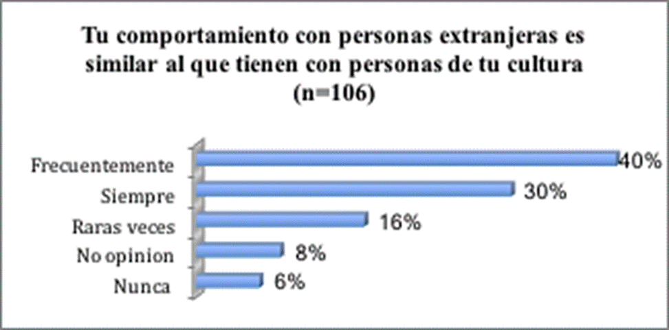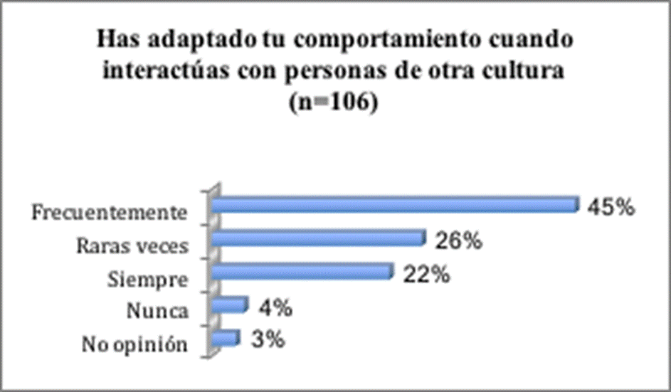 45% los estudiantes resultaron ser frecuentemente adaptables y pacientes cuando interactúan con personas de otra cultura y 22% afirmó que siempre es adaptable y paciente. Solamente 26% adapta raras veces su comportamiento cuando habla con un extranjero y 4% no lo hace nunca.