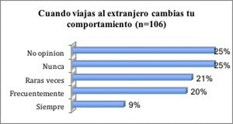 En cambio, resultan interesantes las respuestas que los estudiantes dieron a la pregunta sobre su comportamiento al viajar a un país extranjero (Figura 13). 25% contestó “no opinión” y en el grupo focal la mayoría reportó haber elegido esta opción porque no han viajado al extranjero. Sin embargo, 25% reportó que nunca cambia su comportamiento y 21% que raras veces. 20% declaró que frecuentemente cambia su comportamiento y 9% siempre lo hace.