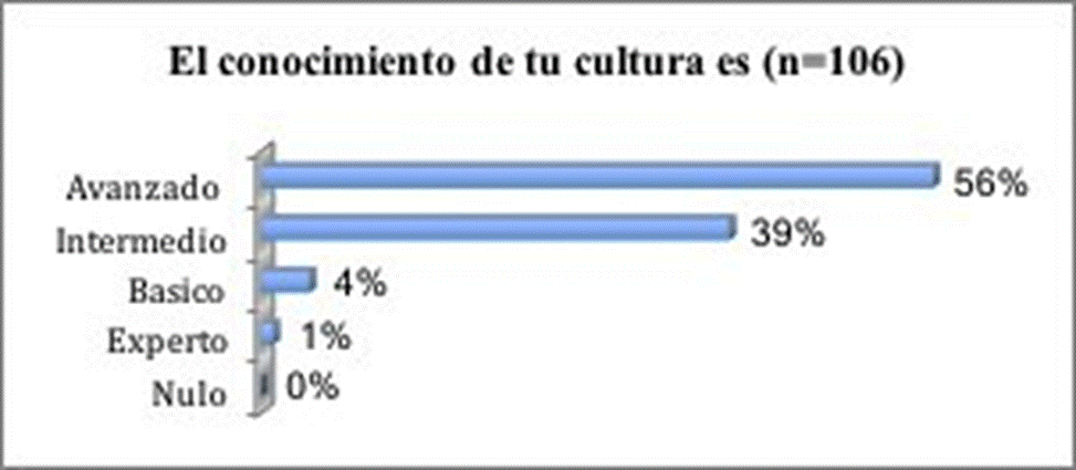 Los estudiantes mencionaron tener un alto grado de conocimiento de su cultura (Figura 14), ya que 56% comenta tener un nivel avanzado y 39% intermedio.