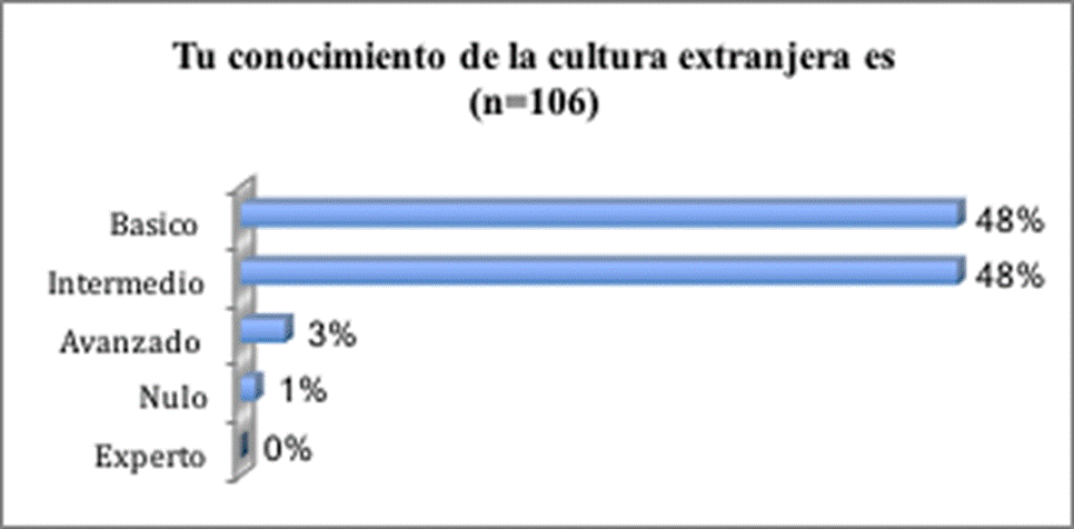 En cambio, se evaluaron a un nivel básico casi la mitad (48%) respecto al conocimiento de la cultura y de la lengua que están estudiando, otro 48% declaró tener un nivel intermedio y solamente 3% manifiesta tener un nivel avanzado (Figura 15).