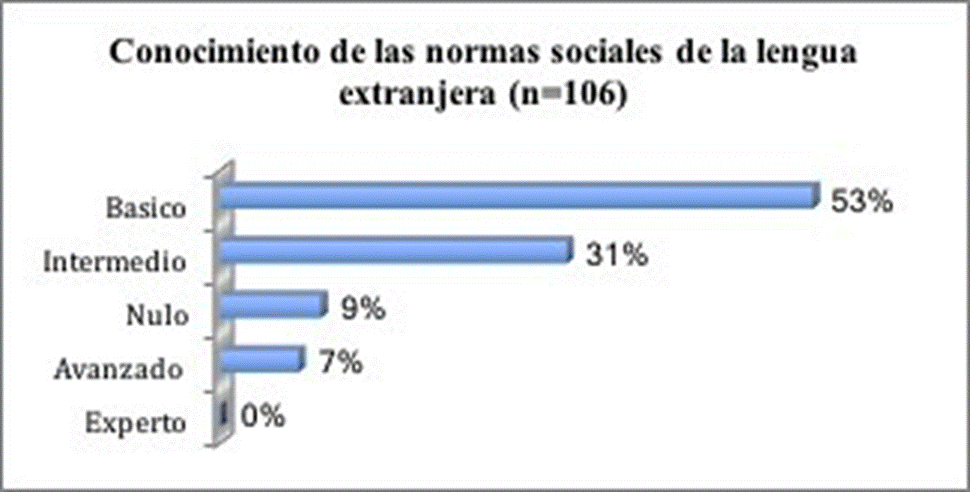 Los resultados anteriores se repiten para el conocimiento de las normas sociales de la lengua extranjera que estudian (Figura 16), 53% declara tener un conocimiento básico, 31% intermedio y solamente 7% manifestó tener un nivel avanzado.