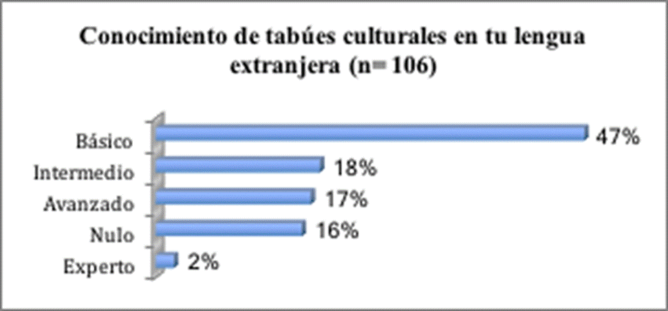 Igualmente, para el conocimiento de tabúes culturares de la lengua extranjera (Figura 17), 47% declara tener un conocimiento básico, 18% intermedio, nulo 16% y 17% declaró tener un nivel avanzado.