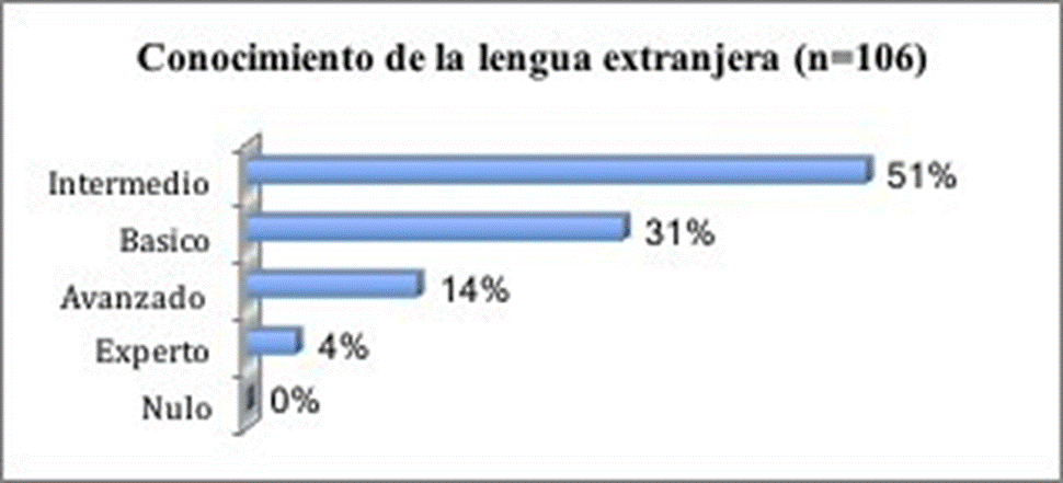 Los resultados varían un poco en cuanto al conocimiento de la lengua extranjera (Figura 18), donde los estudiantes se evalúan más alto: 51% (la mitad) expone que posee un conocimiento intermedio, pero 31% menciona tener un nivel básico y solamente 14% declaró colocarse en un nivel avanzado.