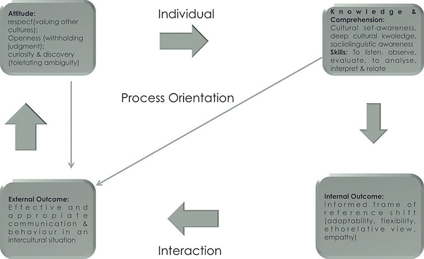 Según el modelo Deardorff (2011) la competencia intercultural es formada por la actitud, el conocimiento y la comprensión; los resultados externos e internos al individuo. Es central que el individuo desarrolle pensamiento crítico para evaluar sus conocimientos, como también tener una actitud de respeto y curiosidad hacia las otras culturas. Según la autora, el individuo competente interculturalmente debería tener la habilidad de ver las cosas desde el otro punto de vista, que es aún más importante que el conocimiento declarativo (Deardorff, 2011).