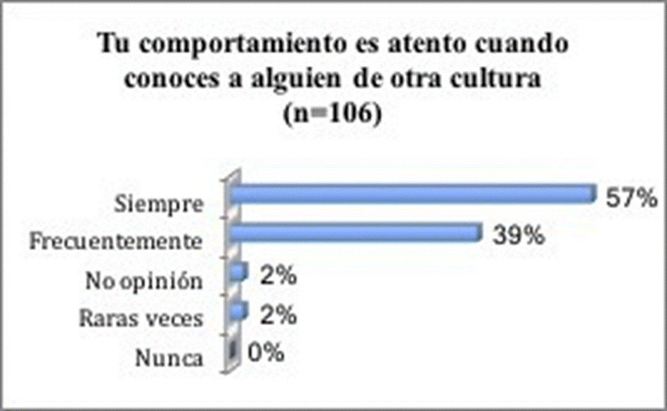 En efecto, 57% de los estudiantes expone que es siempre respetuoso cuando conoce a alguien de otra cultura y 39% lo hace frecuentemente.