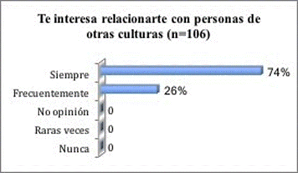 Respecto a la curiosidad, 74% siempre tiene curiosidad hacia personas de otras culturas, independientemente de su edad, sexo, cultura o condición social, y 26% contestó que frecuentemente.