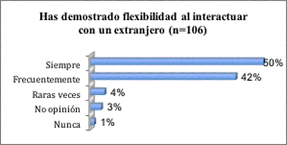 En cuanto a la flexibilidad y tolerancia, 50% es siempre flexible cuando interactúa con una persona extranjera y 42% lo es frecuentemente.