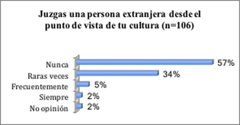 También en relación con etnorrelativismo y suspensión del juicio, según el modelo desarrollado por Bennett (2004), el Develpmental Model of Intercultural Sensitivity (DIMS), los estudiantes se sitúan en el lado del etnorrelativismo, puesto que 57% dijo que nunca juzga una persona desde el punto de vista de su cultura y 34% lo hace raras veces. Únicamente 5% contestó que frecuentemente. 2% afirma que siempre lo hace y se sitúa en una posición etnocéntrica de Defensa (Bennett, 2004).