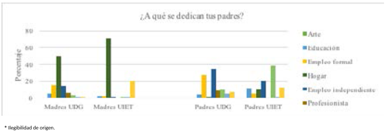 En relación con la ocupación de los padres, en la UDG se reporta 35% de trabajadores independientes y 27% de empleados en una actividad laboral formal. En tanto en la UIET, 38% señala que se ocupan en actividades diferentes a las propuestas; de los diálogos con el estudiantado se identifican trabajos relacionados con la agricultura y ganadería. También cabe resaltar que en la UIET se reporta un porcentaje más alto de padres que atienden el hogar, con 11%, en tanto en la UDG se reduce a 1%.