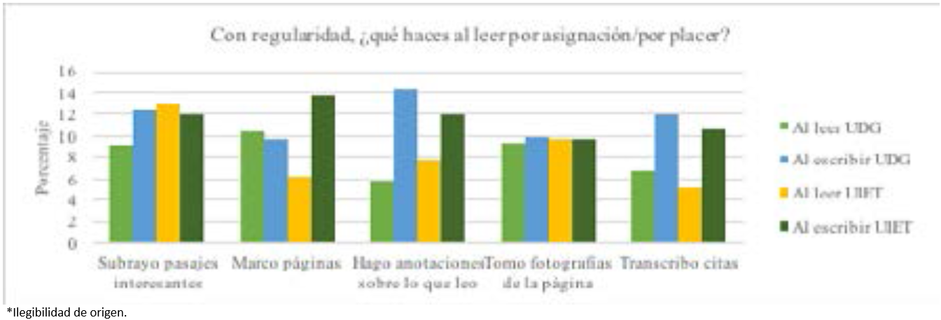 Adicionalmente, al leer en la UDG prefieren marcar las páginas en pasajes interesantes, tomar fotografías del extracto que les interesa o subrayarlo en el texto; mientras que en la UIET tienen como práctica primordial el subrayado de los pasajes interesantes (Figura 10).
