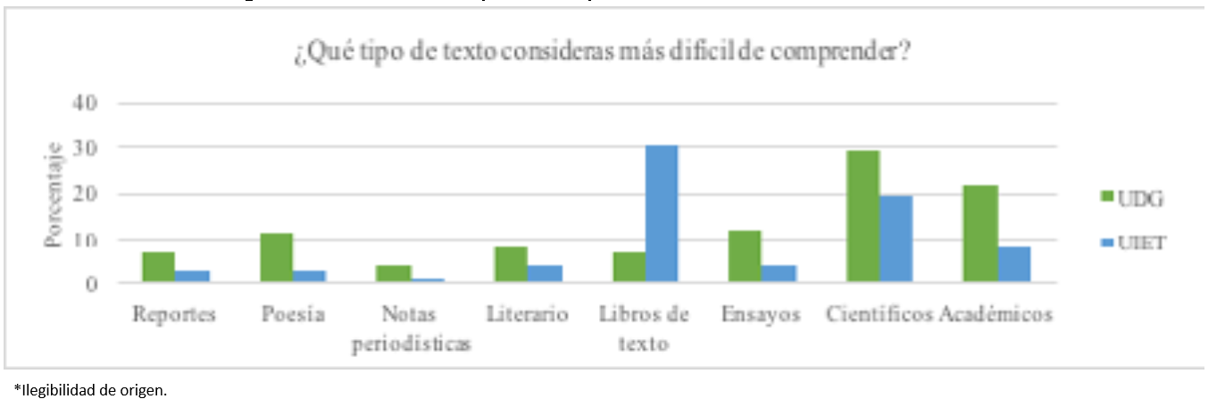 Adicionalmente, se les interrogó sobre los textos que consideran más difíciles de comprender, a lo que el estudiantado de la UDG señaló que son los textos científicos y académicos. Mientras que en la UIET, principalmente son los académicos y los libros de texto. Al indagar sobre las razones por las que consideran que se les dificultan este tipo de textos, en la UDG expusieron que consideran que se debe al vocabulario, y en la UIET apuntan que, además de lo anterior, la estructura es un gran factor que les dificulta la lectura (Figura 11).