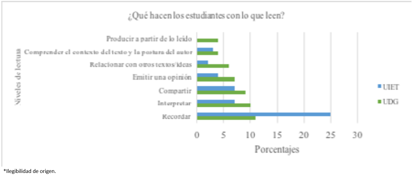 Finalmente, con base en Cassany, Luna y Sanz (2003), se les cuestionó sobre los niveles de lectura que consideran logran alcanzar (Figura 12); en ambas instituciones se observó que los porcentajes de frecuencia se fueron reduciendo en los niveles más altos, como producir algo a partir de lo que leyeron. Sin embargo, en la UDG la diferencia entre el primero y el último nivel es de 7%, mientras que en la UIET la diferencia es de 25%.